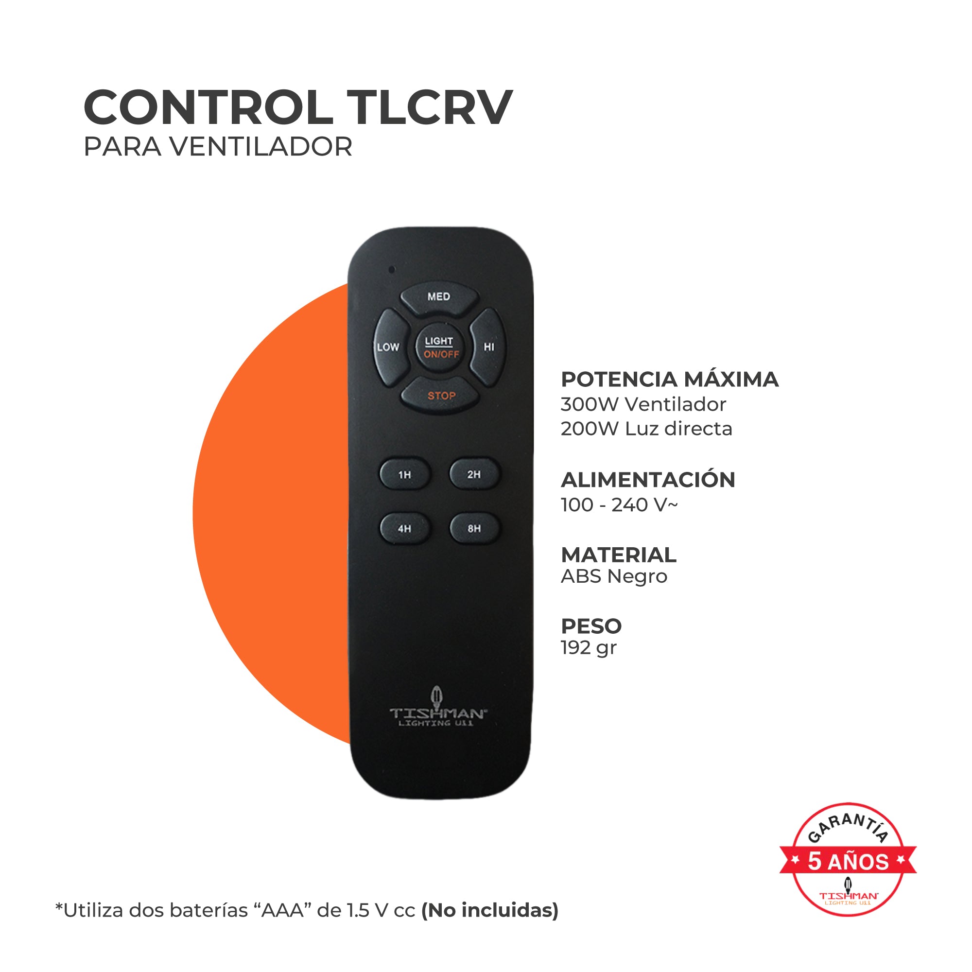 Fabricado en ABS resistente de color negro, garantiza durabilidad y un diseño discreto que se oculta fácilmente en la campana del ventilador. El control remoto compacto mide 14 cm y requiere 2 baterías AAA (no incluidas). Confía en la calidad premium de Tishman Lighting USA, respaldado por una garantía exclusiva de 5 años. Seguridad, practicidad y tecnología al alcance de tu mano para renovar tu espacio hoy mismo.